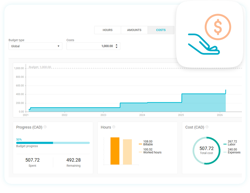 - Set budget tracking by hour, amount or cost