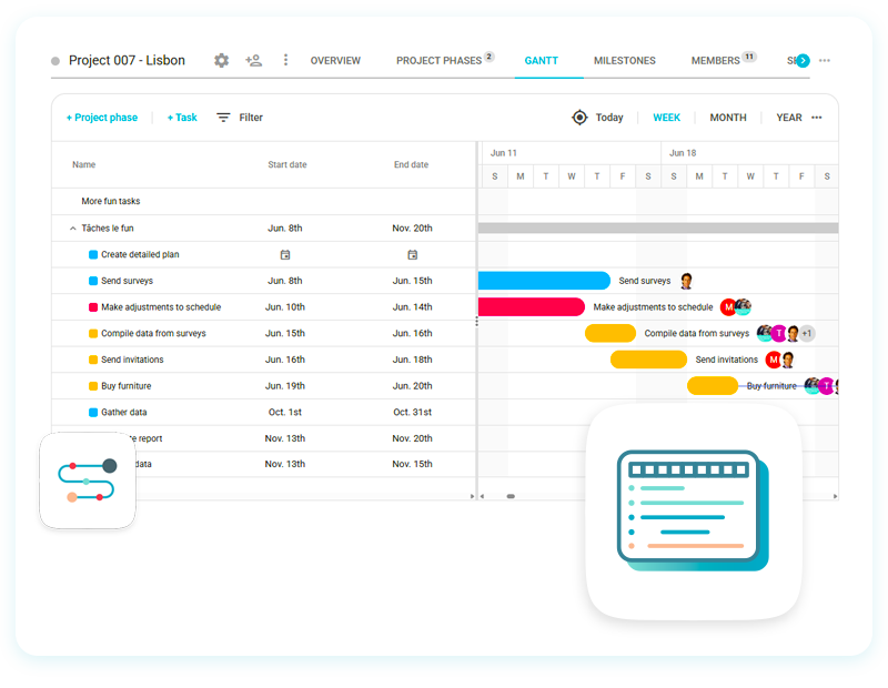 Visualize the progress of all your projects over time by displaying what needs to be done, when and by whom with the global Gantt chart.